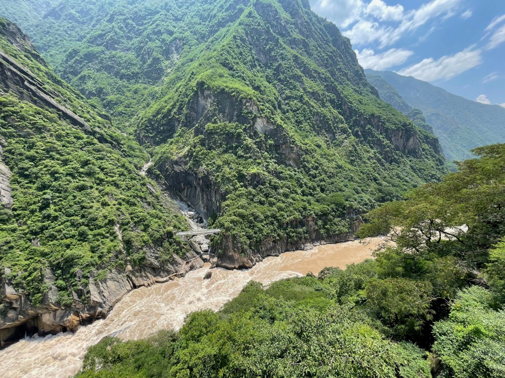The road to tiger leaping gorge is, in places, cut into the rock face with sheer drops on the side. At the visitor center, about 500 meters above the gorge is my guess, there are two options to go down into the canyon. One is by foot, another is by escalator. We decided, in the interest of preserving our energy, to walk down and take the escalators back up. With almost 83F (~28c) and the sun beating on our head that was a wise move. At the bottom of the canyon there is a boardwalk that goes right by the gorge itself. It offers a spectacular view of the fast-flowing river next to it. It is surprising that you can walk only a few meters away from a raging torrent of water.