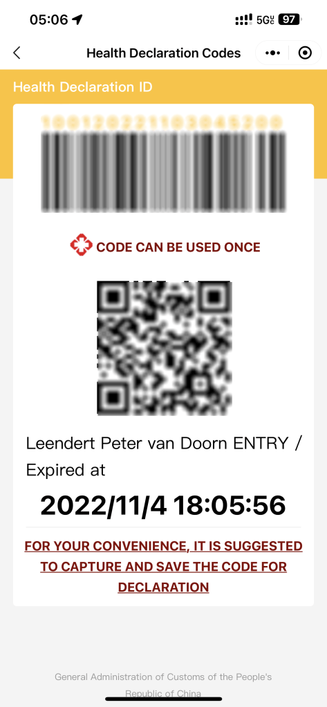 Apart from the health code, you also need a customs QR code. That is different from the last time. Previously I had to fill out many on-line forms when I arrived in Shanghai, this time I just had to show my QR code. Getting the customs QR code is easy, in WeChat (you need that for anything in China) search for “China customs” and install that app. Fill out the health declaration form, take a screen shot of the QR code, and fill out the consent form for sampling. That’s all, with this QR code I was out of the airport within 25 minutes and that included taking a COVID sample and passport control.