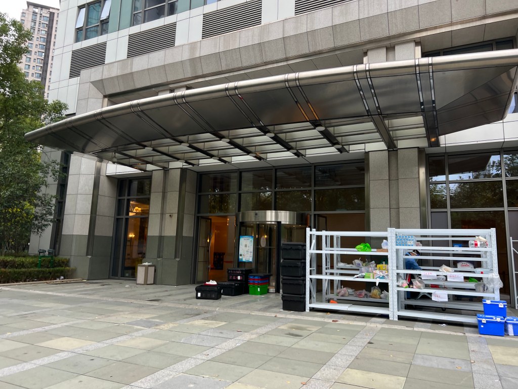 I could see the quarantine guests leave the hotel one by one. The parked car in the lower left is mine.It’s official. I’m cleared for entry into China.One final look at the hotel entrance. The racks on the right are for the individual deliveries.