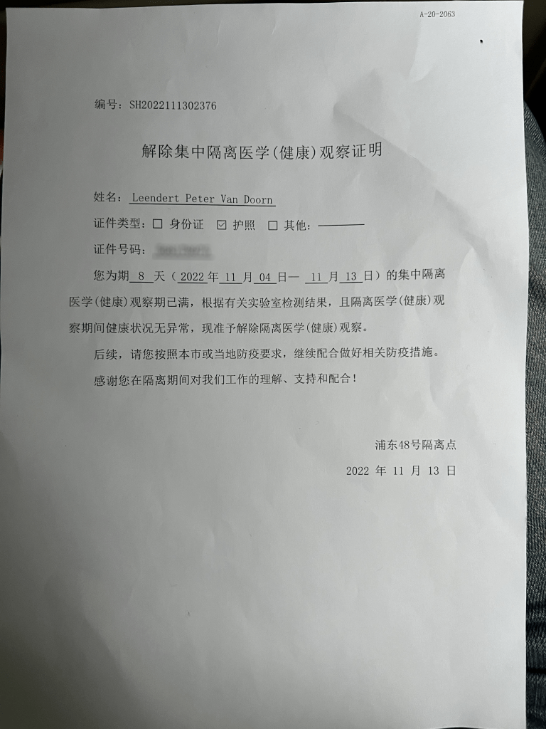 However, at 10:30am still no one had come to my room. I was getting anxious, and I asked my admin to call the hotel. Apparently, they were very busy. With the new regulations they were releasing many more folks than originally planned and I was asked to be patient. Slowly more guests left the hotel until at one point there was only one car waiting by the gate. That was my car as far as I could tell from the picture the driver had sent me. I called the hotel operator and was put through to the doctor’s office, who didn’t speak any English and I was told to wait. Around 11:30am I asked my admin to call the hotel again. Guess what, they had forgotten about me. So finally, around noon I was escorted out of the building. As I walked out, I was given a piece of paper that said I had successfully finished my quarantine and that was it. What can I say, excitement until the very last moment.
