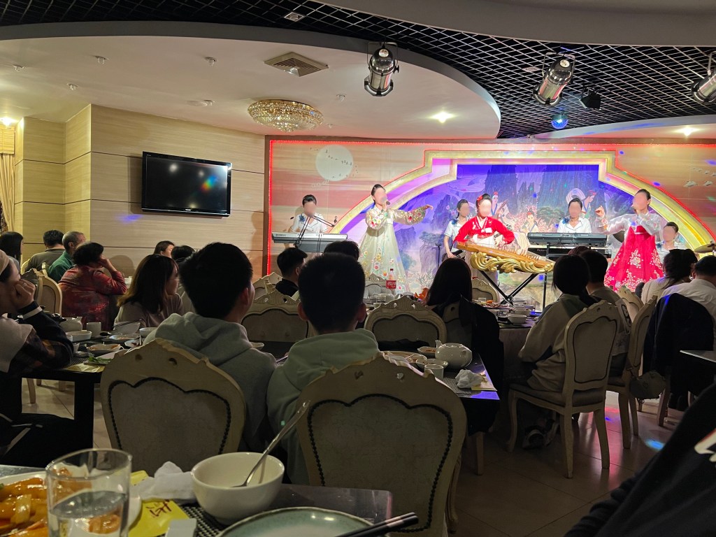 The entire staff at the restaurant was made up of young women (I didn’t see any men) from North Korea. They smiled the whole time and spoke Chinese with a strong accent that even I could detect. One of my friends tried to get the WeChat address of one of the waitresses and she told us that she wasn’t allowed to have an individual one, and she gave him the restaurant one. Dinner was also accompanied by a show where the waitresses turned into quite skilled performers playing various North Korean and Chinese songs. Curiously, you weren’t allowed to take pictures of the staff, but I managed to sneak some in anyway (I blurred their faces because I don’t want to get folks into trouble). Clearly these folks were under tight control of the North Korean government.