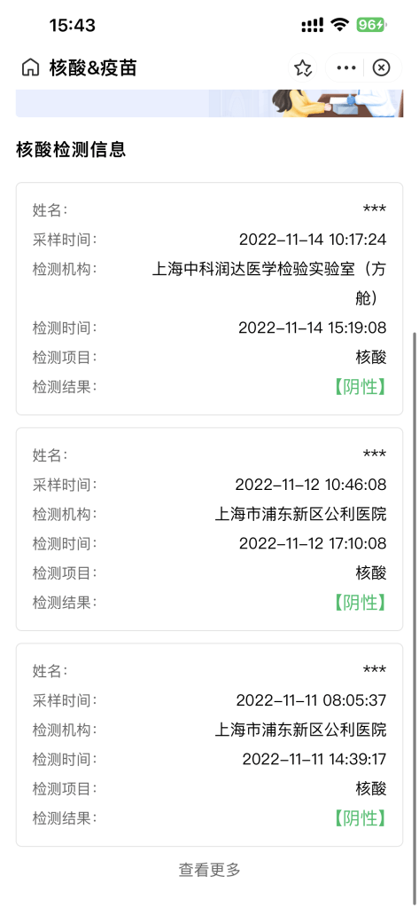 Later that afternoon I was playing with the health code App. It has a set of extra buttons/functions that I had not figured out yet. In my defense, its all in Chinese. In doing so I stumbled onto a log of all my COVID tests. I could see all the tests that were taken during my quarantine (all negative) and I saw that the test I took in the morning was still pending. While I was fooling around with the App, my test result came in and it showed up as negative. I was quite impressed at the efficiency of taking these COVID tests and tracking the results. Yes, these 3-day COVID tests are invasive, but they are administered very efficiently. A friend on mine who works in Shanghai mentioned that its even easier for him, they just come into his office every 3 days.