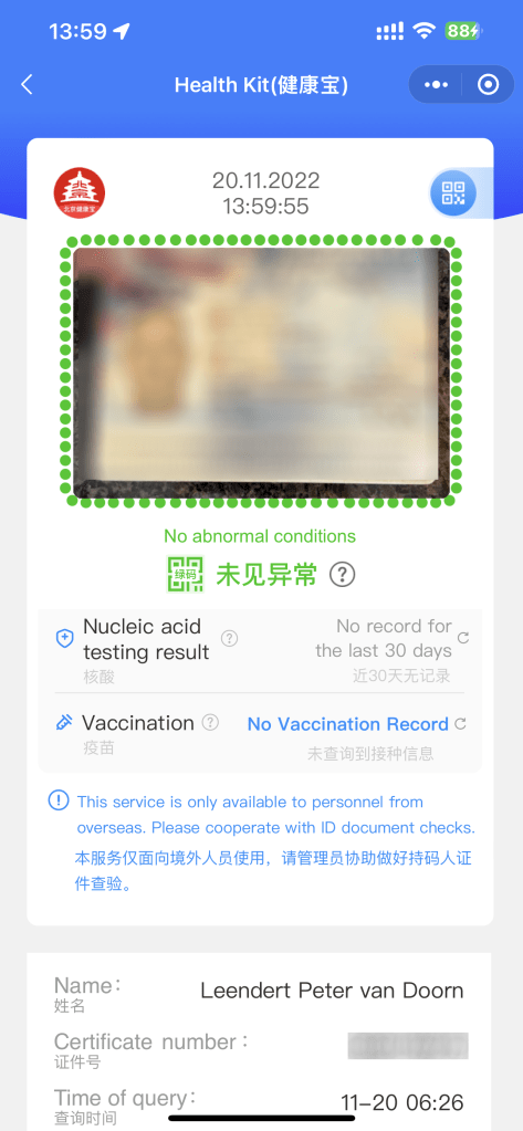 To get a valid health code, you need to have the right paperwork: A valid passport, a valid visa (issued after March 2021), a valid plane ticket, and 2 negative COVID test reports from a CLIA accredited testing facility. You also need to submit your CDC vaccination card(s) and a form attesting that these cards are valid. Much to my surprise when I submitted all this information on the embassy website (here) it also asked for a personal health form which I hadn’t seen before. I quickly googled it and downloaded the first form I came across and filled it out. I was a bit surprised that it had all sorts of questions about Singapore in it (which I wasn’t planning on visting) and I submitted it with the rest of my paperwork. Within two hours my submission was approved, and I got a health code (take a screenshot when you get it). Only then I realized that I had submitted the form I got from the Chinese embassy in Singapore. Apparently, it had the information they were looking for but to this day I have no idea where I can get a similar form from the Chinese embassy in the USA.