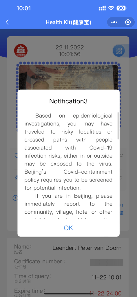 This all happened on Monday evening. If the events leading up to this hadn’t been bad enough, on Tuesday morning I too got the dreaded popup #3. I was no longer allowed into Beijing, so whatever hope I still had of making it to Beijing disappeared. Why you get a popup #3 is a complete mystery and it appears random to everyone I asked. I got one on Tuesday and on Thursday it was gone, only to reappear on Saturday.