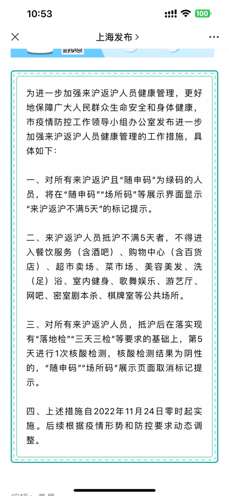 The city is restless and one way this is noticeable is through the never-ending rumors going around the grapevine. On Wednesday the two main rumors were that the Shanghai government was going to shutdown Pudong airport and that they were going to mandate a 60-day lock down. Both turned out to be false. Now at the end of the week things have turned a bit more upbeat. Various cities around China have reduced their anti-COVID measures, from stopping required daily COVID test results for entering public spaces (grocery stores, subways, etc.) to releasing buildings from quarantine. While Shanghai didn’t reduce its mandated COVID tests yet (currently every 48-hours), it did release many buildings across the city from quarantine and you no longer have to show your health code to enter the subway and city parks.