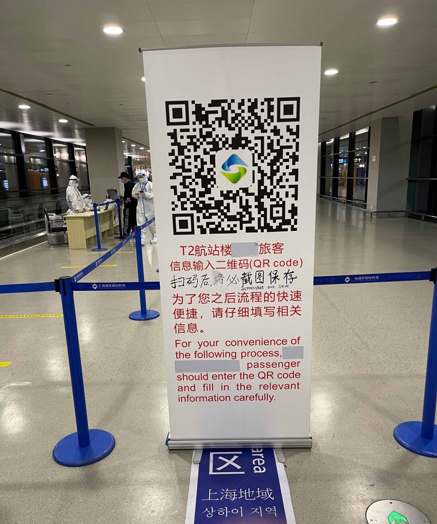 Before the plane landed at Shanghai Pudong International airport, we were all instructed to stay in our seats after we arrived at the gate. The ground crew would tell us when to deplane and in what order. We had to keep our customs health QR code ready for inspection. That was the code we got at the airport by filling out the http://health.customsapp.com/ form, not the health code that we got from the consulate. This wouldn’t be the last form I had to fill out or the last QR code I’d receive that day.