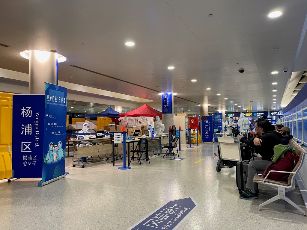 Walking through the terminal I noticed how quiet things were. Typically, the Shanghai airport is buzzing with people but not this time. At the end of the terminal, we arrived at a check point where you had to scan your QR code. You were then directed to a long row of small desks (mine was 31) where folks interviewed you about your health form. Of course, all the airport employees were in full PPE the whole time. Suit, masks, face guard, the works.