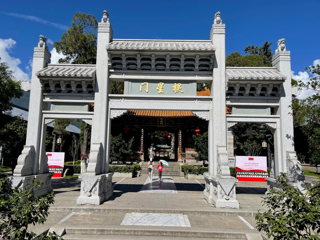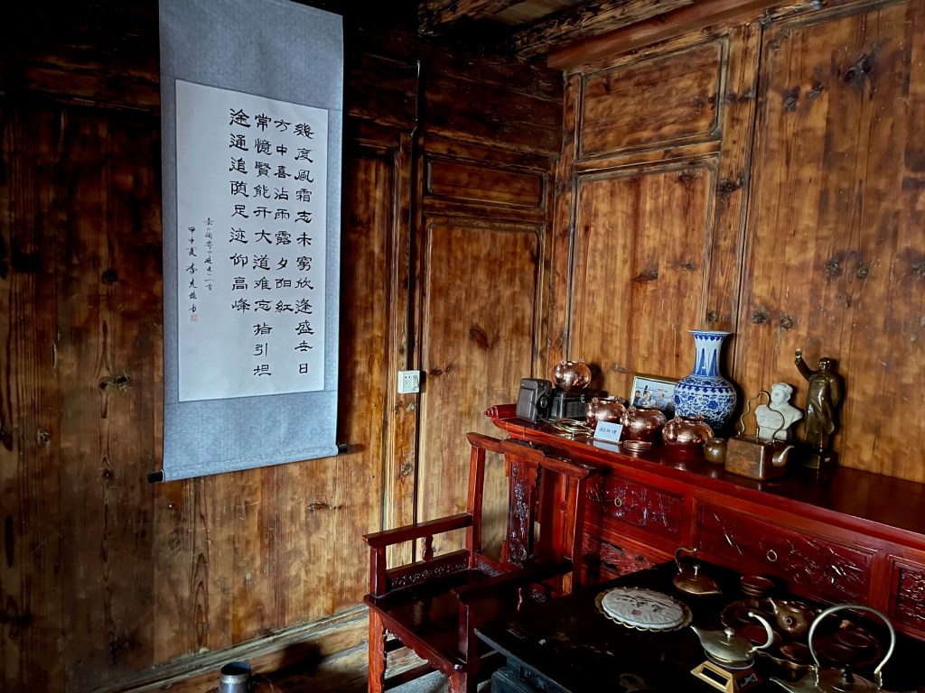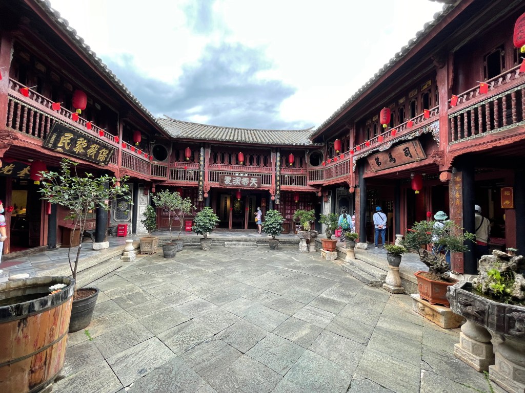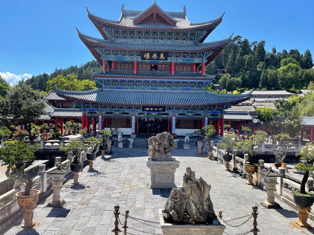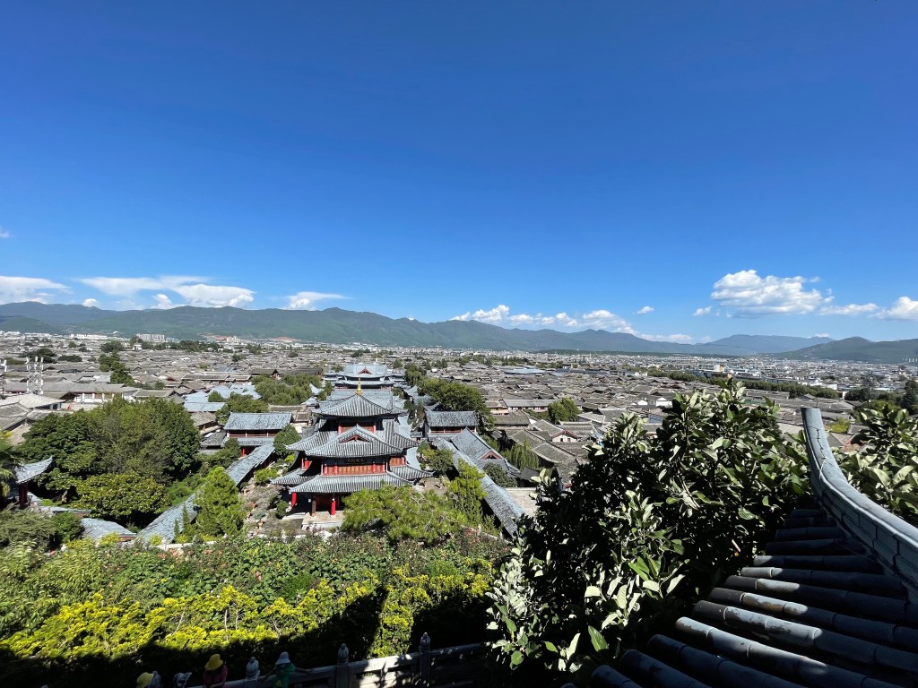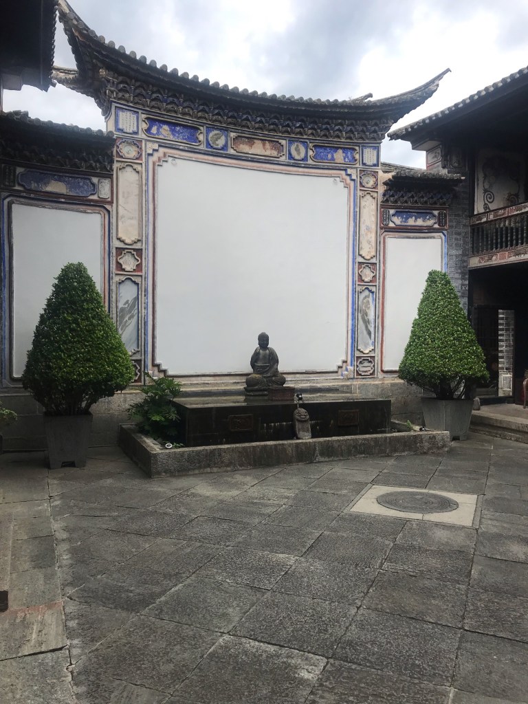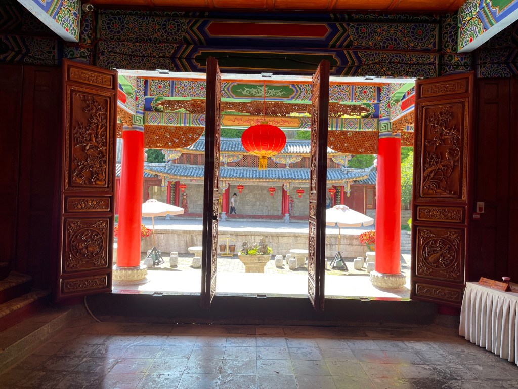 The most beautiful part of Lijiang was the Mu Family Mansion. It’s a large complex that starts at the bottom of a hill in the middle of the city and follows the contours up the hill. The Mu family ruled over Lijiang and its surroundings and the complex is a mixture of official buildings (meeting halls, library), temples of various religions and personal living space. The Mu family focused on trade and was closely associated with the emperor. The city never had any city walls and apparently that wasn’t necessary because the Mu rulers kept good relationships with everyone. However, the fact that Lijiang is surrounded by high mountains on all sides with only a few river valleys in-between probably had something to do with it as well.