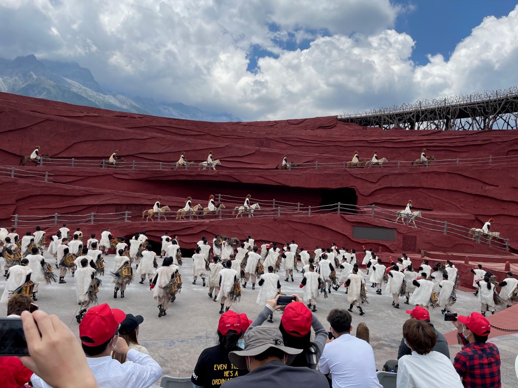 Yulong is part of a national park which includes a large theatre area where they performed a Naxi culture play. While they provided an English explanation, sort of, the nuances escaped me but the larger story was something like this: The men went on long caravan rides to trade goods, the women stayed home and did all the hard work, when the men came home they got drunk first with their friends, after which the women collected their inebriated men. In typical Chinese fashion, the play was big (well over 150 actors is my guess, and many horses) and very loud.