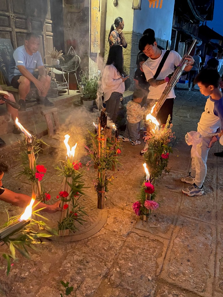 One of the reasons I liked Baisha so much, was because of the Naxi people’s torch festival that coincided with our visit that day. While the original festival was cancelled because of COVID risks, the local people held their own in small gatherings around the town. It felt much more genuine and intimate to see locals dance and light their torches. I was told that the origin of the torch festival was to chase away the dragons before harvest, but after searching the web, I learned that it’s celebrated by other minority groups as well for different purposes, including match making.